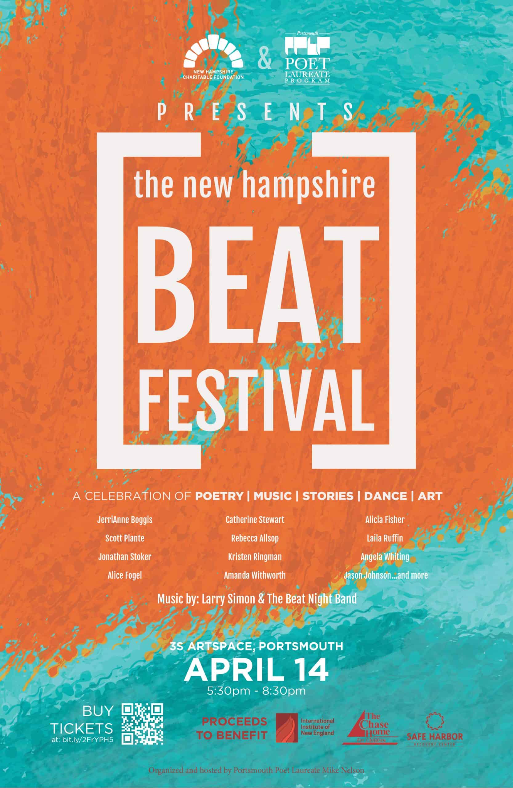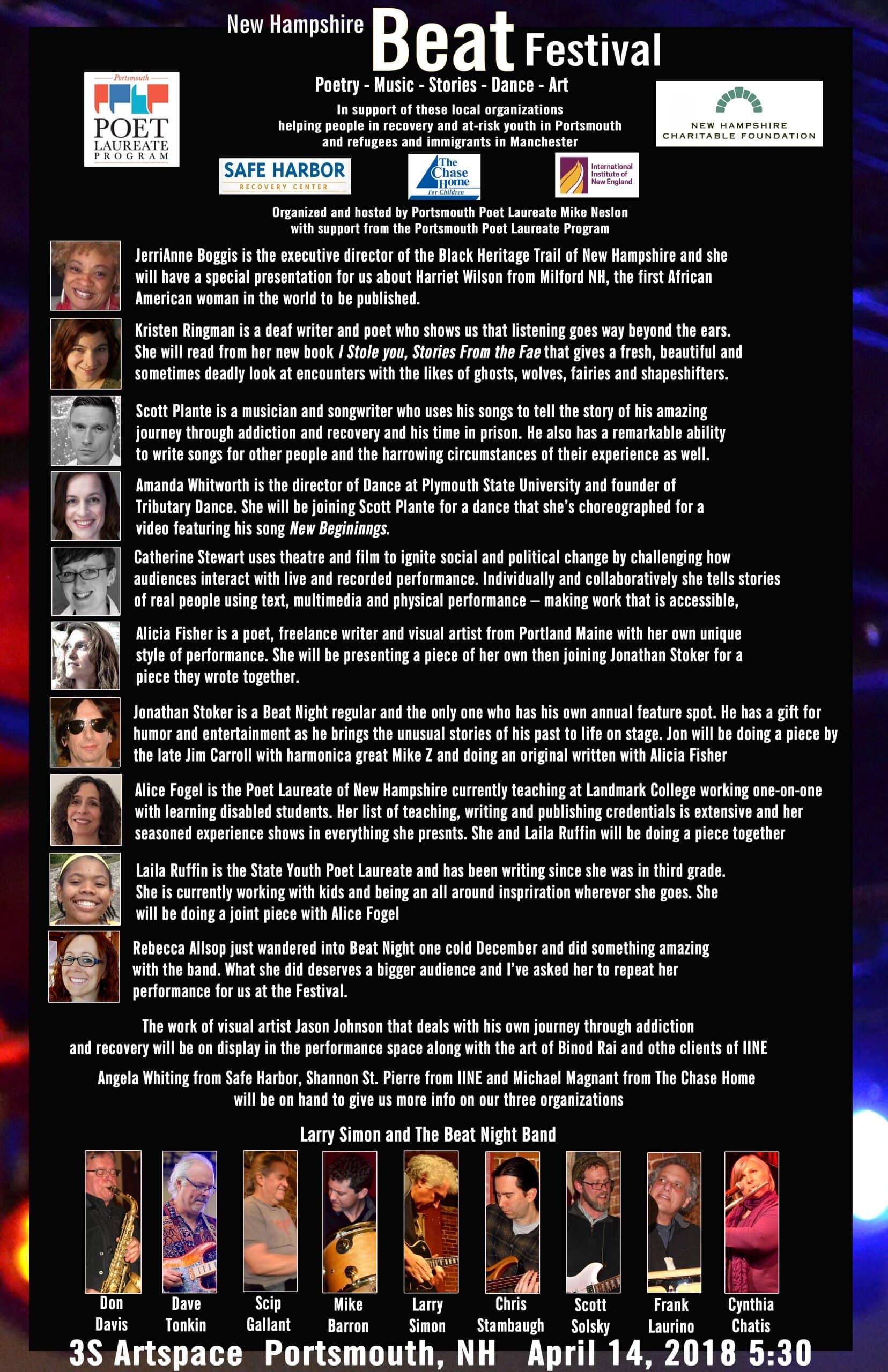 On April 14, 2018, at 3S Artspace, Mike held an event called The Beat Festival, featuring nine regional artists and speakers that include poets, a songwriter, a storyteller, a singer, a historian, an activist, several visual artists, a dancer and the Beat Night Band to celebrate these amazing artists and raise funds for the organizations that Mike had been doing poetry classes with over the last year. Click here to watch Binod Rai, a refugee from Nepal read at The Beat Festival his poem that he wrote in Mike and Alice’s poetry class at IINE. In total, the event raised 2,514 dollars (838 each) for the International Institute of New England, Safe Harbor Recovery Center and the Chase Home for Children. Check out the poster made by Mike Teixeira for the event and the flyer for the event with more info and our list of presenters. And here’s a link to the thank you post with fundraiser results and pictures.